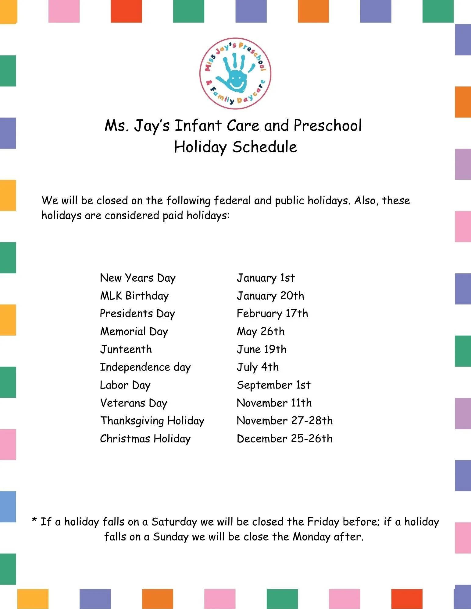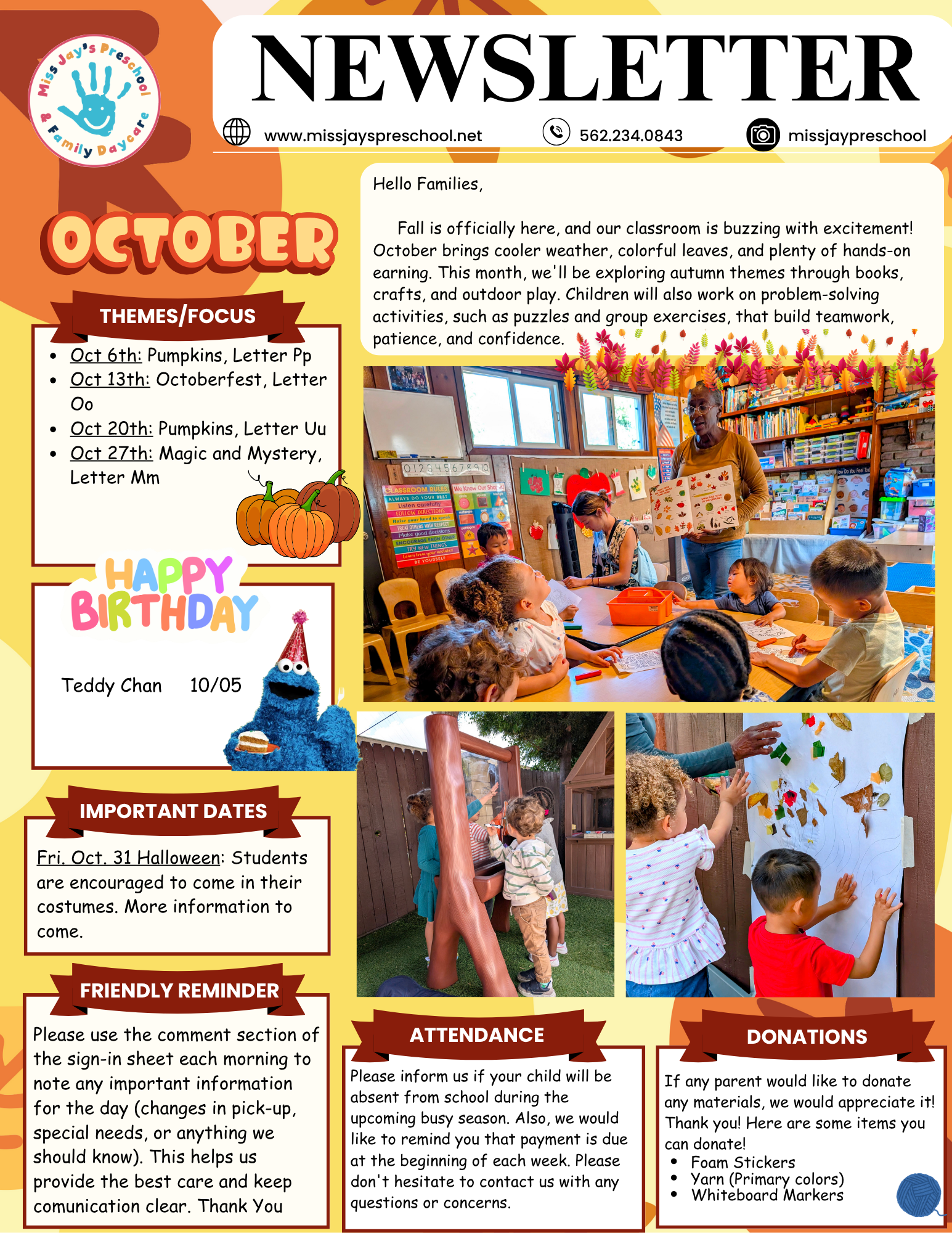 Our calendar keeps families informed about classroom activities, special events, and important reminders. Stay connected and never miss a moment of fun and learning.